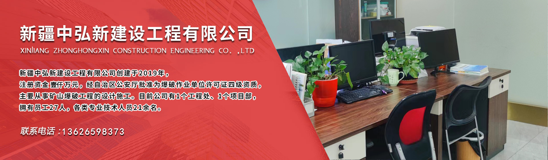 ZHONGHONGXIN CONSTRUCTION ENGINEERING 公 司 簡 介新疆中弘新建設工程有限公司創建于2019年,注冊資金壹仟萬元,經自治區公安廳批準為爆破作業單位許可證四級資質,主要從事礦山爆破工程的設計施工、礦上采掘施工業務。目前公司有1個工程處、2個項目部,分...